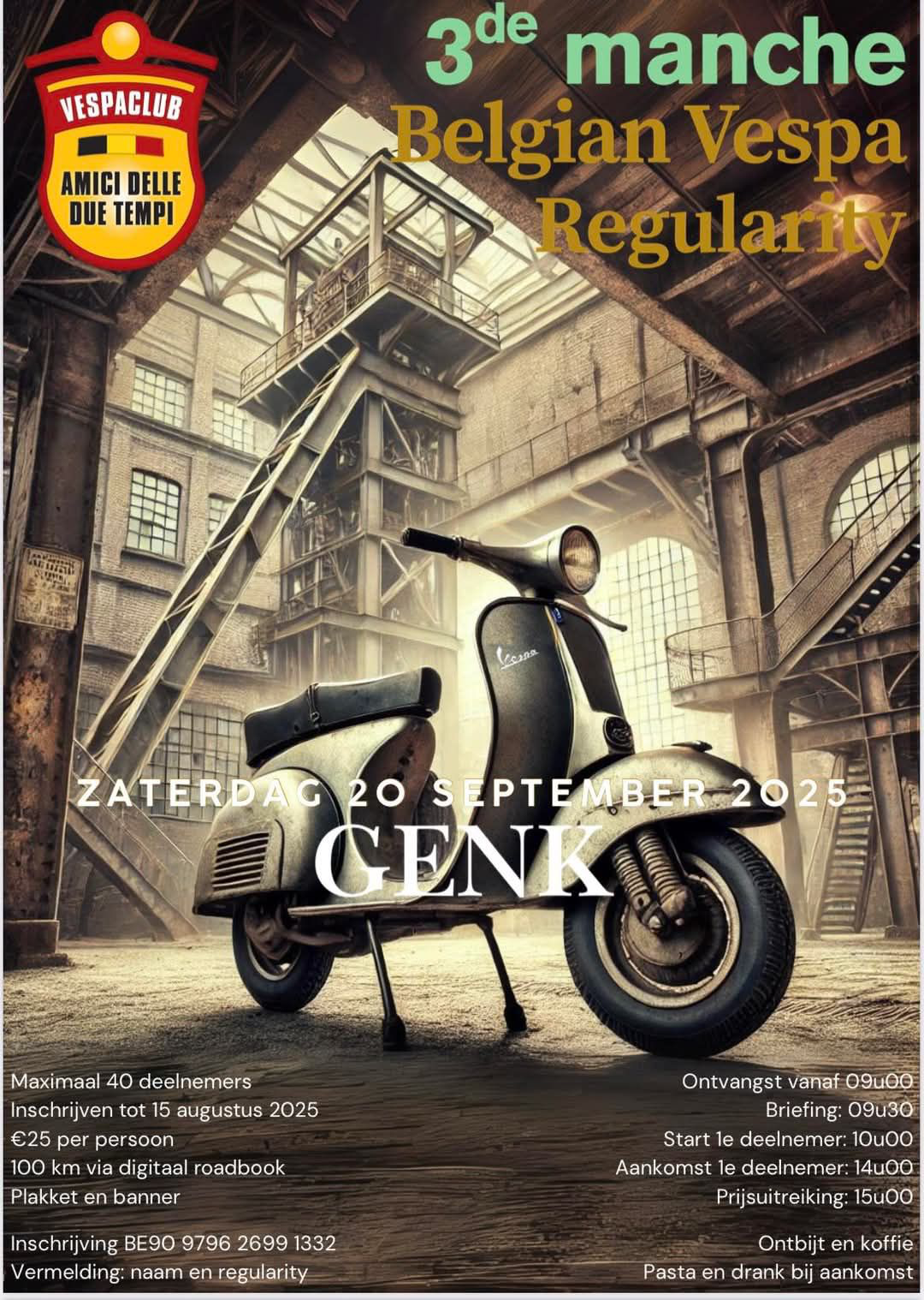 « All Events This event has passed. 3de manche Belgian Vespa Regularity GENK 2025 September 20 « Beach Race 2de hands beurs Camino » Location: Europe - Belgium Contact Organiser for more information… Add to calendar Google Calendar iCalendar Outlook 365 Outlook Live Details Date: 2025 September 20 Event Categories: Ride outs - Road, Ride outs - Scooters and mopeds, Vespa Community Event Tags:Vespa Related Events Bloesemrit May 1 Rallye Vespa May 1 27th Biker day of the military police group May 1