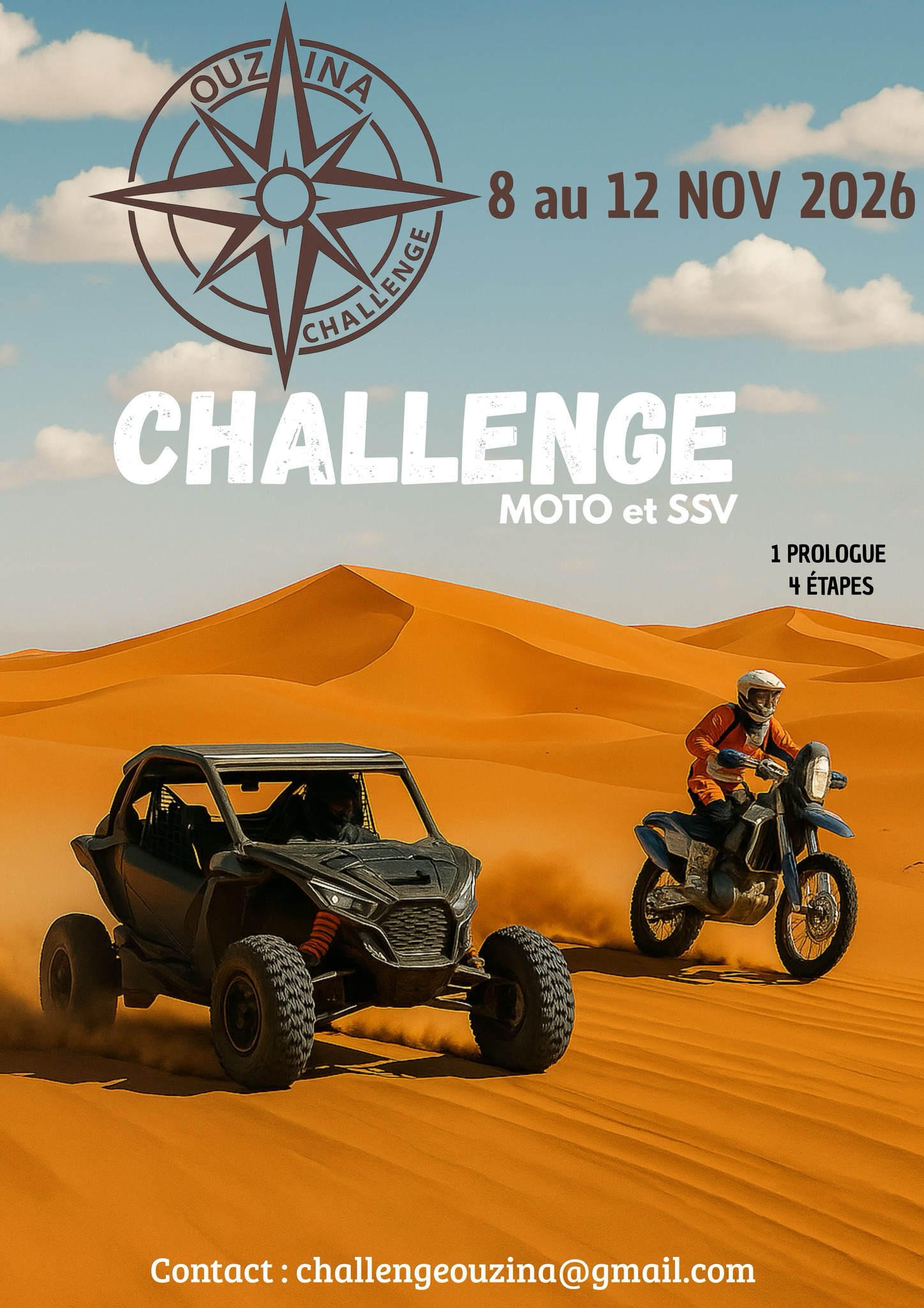 La 1ère édition d'OUZINA CHALLENGE 2026 arrive dans les dunes ! Avec notre Marraine et Parrain d’exception reconnus dans le milieu des sports mécaniques, cet événement incontournable réunira des pilotes en catégorie SSV et Motos. Envie de repousser vos limites et vivre l’émotion du désert au travers d’une expérience inoubliable ? Restez connectés pour plus […]